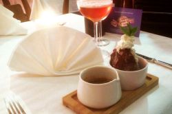 und mit Honig karamellisiert - La Zuppa Inglese luftiges Biskuit getränkt mit hausgemachtem Kermesbeeren- und Rum-Sirup sowie gefüllt mit Chantilly-Crème